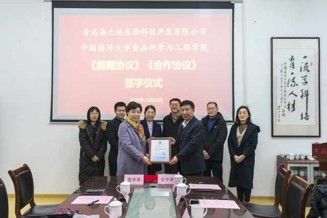 2020年12月24日,青岛海之林生物科技开发有限公司(以下简称海之林)与中国海洋大学食品科学与工程学院(以下简称食品学院)《捐赠协议》《合作协议》签字仪式在食品学院举行。学校党委常委、总会计师、教育基金会理事长王剑敏,青岛海之林生物科技开发有限公司总经理陈宏出席捐赠仪式。青岛海之林生物科技开发有限公司向学校捐资10万元人民币,用于支持中国海洋大学食品学院人才培养。