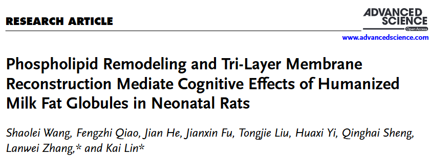 日前,中国海洋大学食品科学与工程学院功能性乳品与益生菌团队在乳脂肪球母乳化领域取得重要研究成果,该研究全文在线发表于国际知名综合学术期刊Advanced Science《先进科学》(Q1,中科院1区Top,IF2024=14.1),题为“Phospholipid Remodeling and Tri-layer Membrane Reconstruction Mediate Cognitive Effects of Humanized Milk Fat Globules in Neonatal Rats”。该论文通讯作者为张兰威教授和林凯副教授,第一作者为食品科学与工程学院2021级博士研究生王少雷,中国海洋大学为唯一通讯单位。